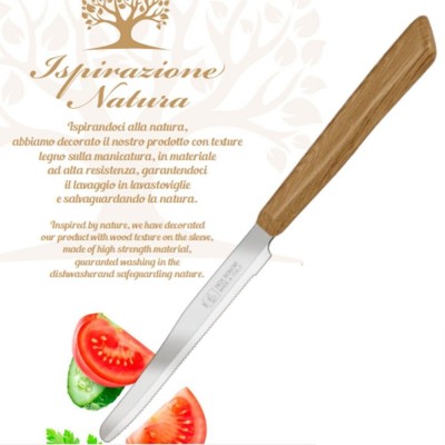 L'estetica è curata nei minimi dettagli grazie alla finitura del manico. Realizzato in polipropilene ad alta resistenza tramite iniezione diretta, il manico presenta una texture effetto legno rovere beige incredibilmente realistica. Questo materiale non solo dona un tocco rustico e raffinato alla mise en place, ma assicura che il prodotto rimanga indeformabile, igienico e inalterato nel tempo, superando i limiti del legno tradizionale.