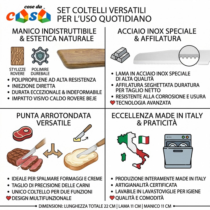 Cose da casa vi propone un'esperienza di taglio superiore che unisce la maestria della manifattura italiana all'innovazione dei materiali moderni. Questo set da 12 pezzi è stato studiato per offrire una versatilità totale in cucina e a tavola, suddividendosi in 6 coltelli a punta, ideali per bistecche e pizze, e 6 coltelli a punta arrotondata, perfetti per l'uso quotidiano e per spalmare.