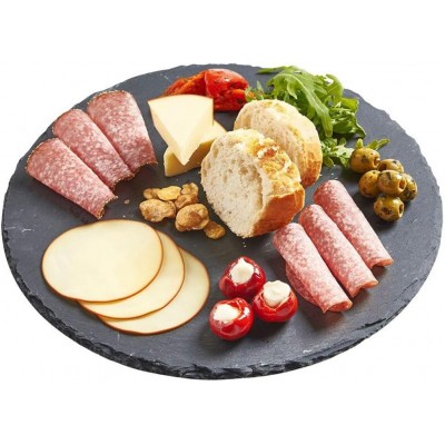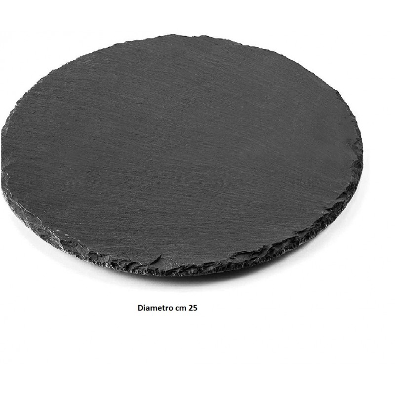 Piatto vassoio tondo in ardesia naturale di colore nero, dal diametro di 25 cm, perfetto per un utilizzo professionale o domestico. La pietra di lavagna è ideale per servire con stile sushi, formaggi, salumi, finger food, dolci o antipasti, grazie alla sua superficie liscia e al suo aspetto elegante. I bordi sono frastagliati per mettere in risalto la struttura naturale della pietra. Sul retro, i supporti in gommapiuma garantiscono che il vassoio sia antiscivolo e non graffi le superfici. Un oggetto utile e di design che valorizza ogni tavola.