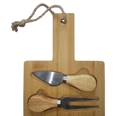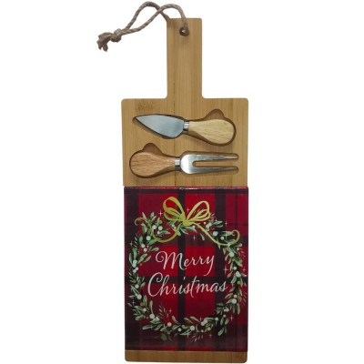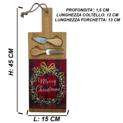 Realizzato in legno naturale con decorazioni natalizie, questo tagliere misura 45 cm di lunghezza e 15 cm di larghezza, ed è dotato di manico con laccetto per essere appeso facilmente in cucina o usato come elemento decorativo. Inclusi nella confezione anche un coltello e una forchetta da portata, entrambi con manico in legno abbinato al tagliere per una presentazione elegante e coordinata.