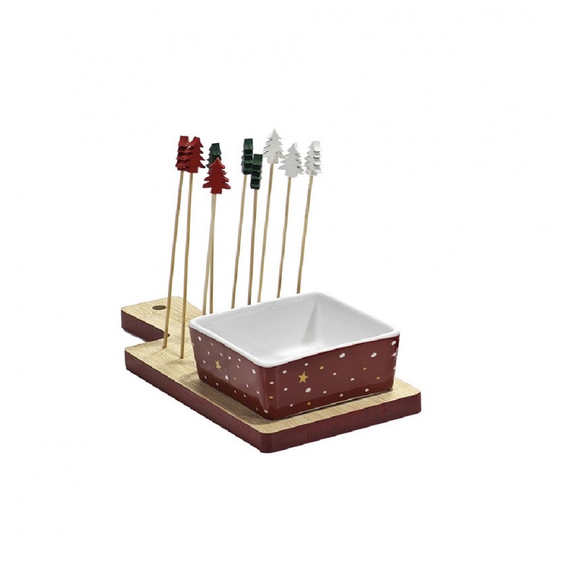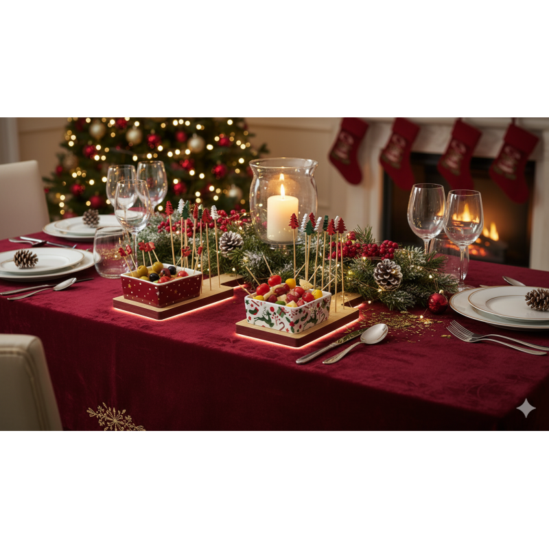 Porta Stuzzichini/Olive con Accessori: La base è completata da un alloggiamento pensato per gli stecchini a forma di Albero di Natale (inclusi), perfetti per servire olive, formaggi o altri stuzzichini in modo igienico e tematico.