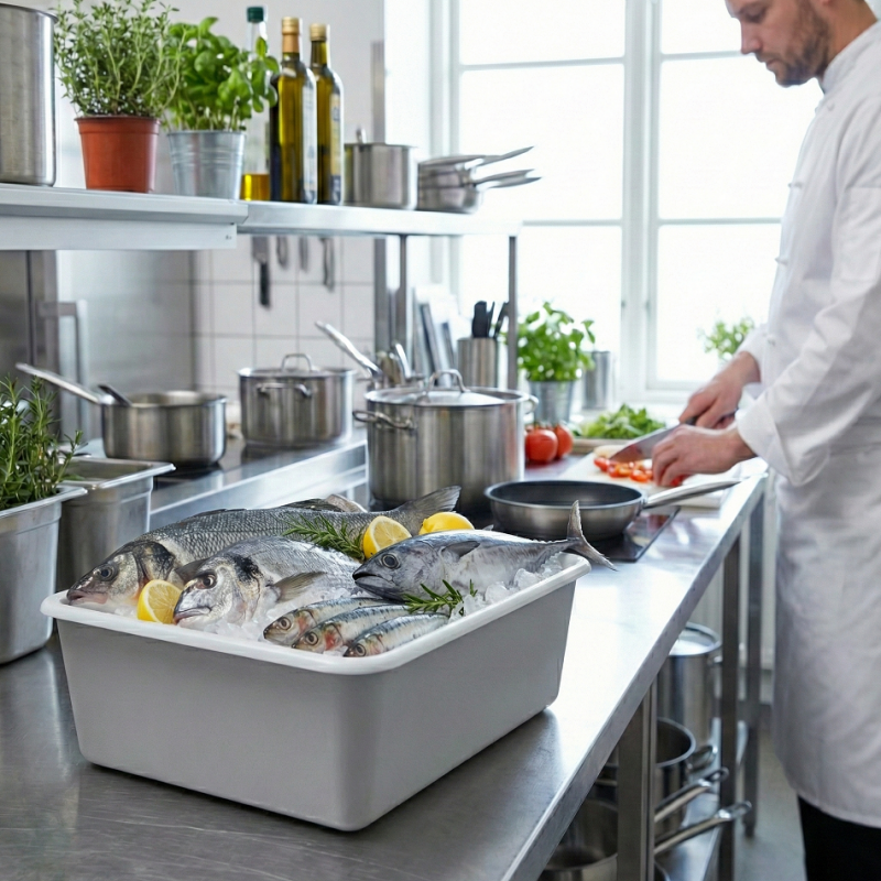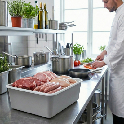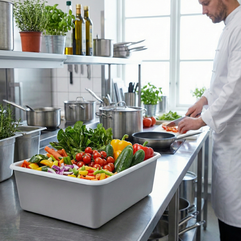 COSEDACASA Vi propone una vaschetta frigo professionale in plastica bianca da 5 litri, progettata per garantire massima igiene, robustezza e praticità in ambienti di lavoro alimentari e domestici.