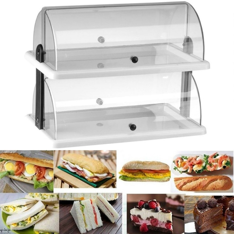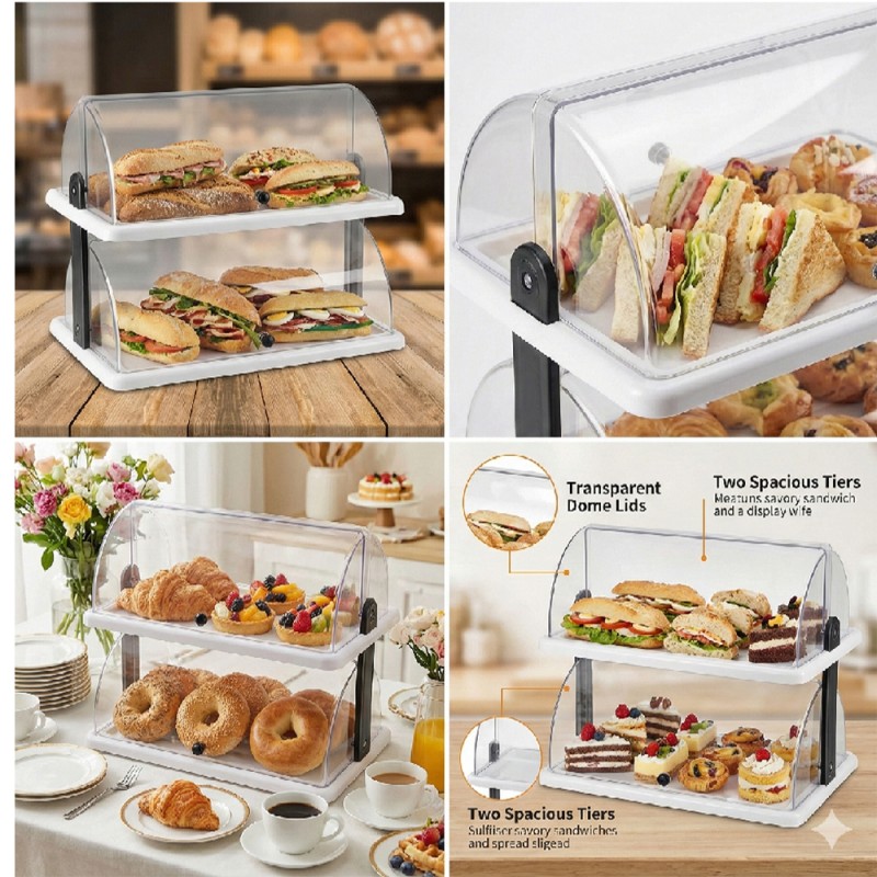 Cose da casa vi propone un sistema espositivo verticale progettato per ottimizzare lo spazio sul bancone senza sacrificare la capienza. Questa vetrina a due ripiani sovrapposti è la soluzione definitiva per bar, hotel e B&B che desiderano presentare i propri prodotti da forno con eleganza e massima igiene. Ogni ripiano è dotato di una cupola in plexiglass trasparente con sistema di doppia apertura basculante e pomelli neri resistenti, permettendo un accesso rapido e agevole sia per il personale che per i clienti in modalità self-service.