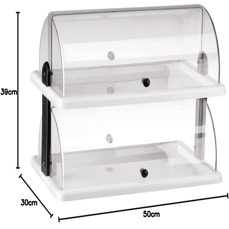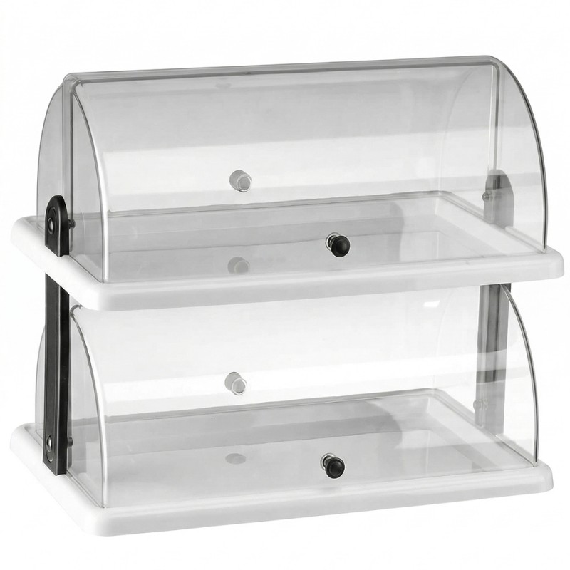 Vetrina espositiva a 2 piani con cupole trasparenti e vassoi bianchi.