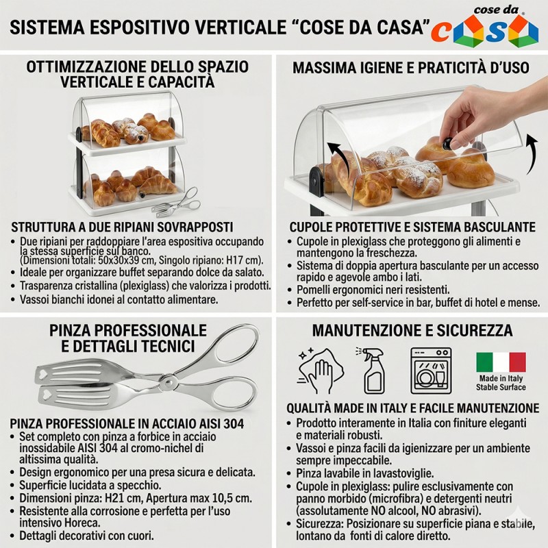 Set espositore professionale a due ripiani sovrapposti (50x30xh39 cm) con vassoi bianchi in plastica alimentare e cupole in plexiglass a doppia apertura. Include una pinza a forbice in acciaio inox AISI 304 (21x8 cm) lucidata, ergonomica e lavabile in lavastoviglie. Prodotto interamente in Italia, garantisce massima igiene e visibilità per brioches, cornetti e prodotti da forno.