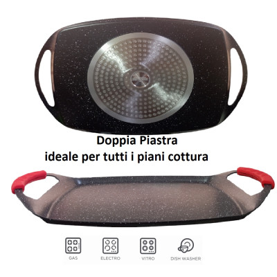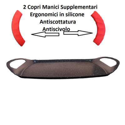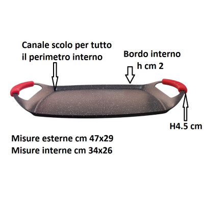 Scopri la bistecchiera rettangolare di COSEDACASA, realizzata in alluminio di alta qualità e rivestita con DYLON per un’ottima antiaderenza. Con misure esterne di 47x29 cm e interne di 34x26 cm, questa piastra ha un'altezza di 4,5 cm ( fino ai manici). il bordo interno e' alto h 2 cm È compatibile con tutti i piani cottura e viene fornita con 2 copri manici in silicone ergonomici anti scivolo e antiscottatura. Lavabile in lavastoviglie e dotata di un canale per la raccolta dei liquidi in tutto il perimetro interno.