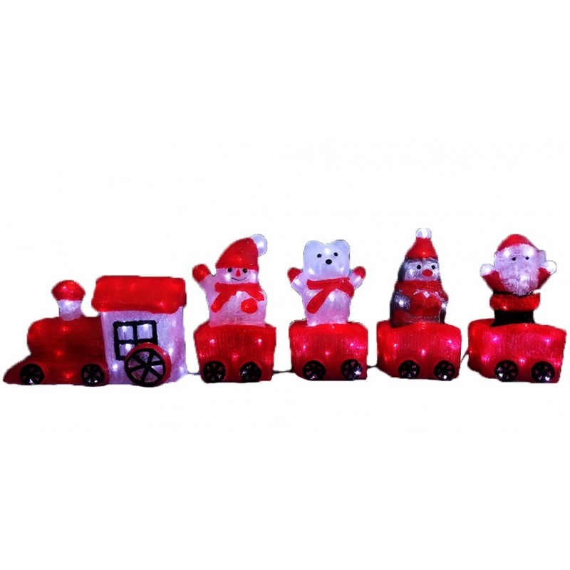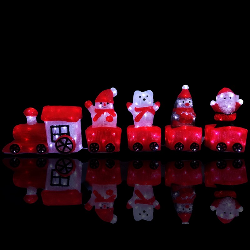 COSEDACASA Vi propone un’elegante e scenografica decorazione natalizia: un treno luminoso da 102 cm composto da 5 elementi (locomotiva + 4 vagoni), ciascuno impreziosito da uno dei personaggi classici del Natale: pupazzo di neve, pinguino, Babbo Natale e orso polare.
