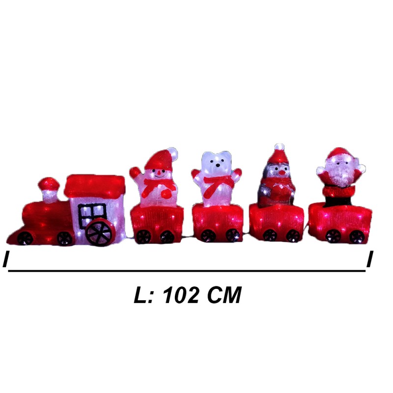 COSEDACASA Vi propone un magnifico treno natalizio da 102 cm composto da locomotiva + 4 vagoni, con 200 luci LED ad alta efficienza per un effetto luminoso suggestivo sia in interni che esterni. Ogni vagone è decorato con uno dei personaggi amati del Natale: pupazzo di neve, pinguino, Babbo Natale e orso polare. Realizzato in acrilico trasparente / policarbonato di alta qualità, resistente alle intemperie (pioggia, neve, gelate), ideale per uso interno ed esterno.