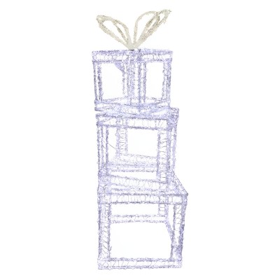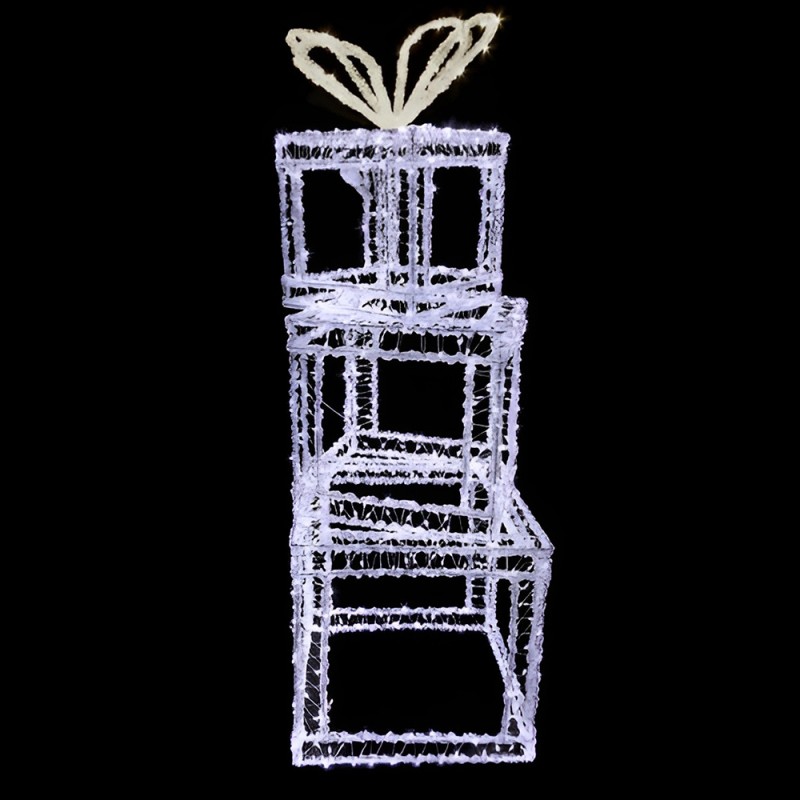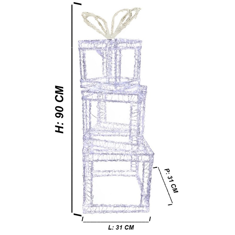 Set 3 Pacchi Regalo Natalizi Luminosi COSEDACASA – 1200 luci LED bianco freddo ghiaccio, struttura in metallo e acri-lico, ideali per decorare con eleganza interni ed esterni. Altezza 90 cm, dimensioni 31x31 cm.