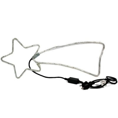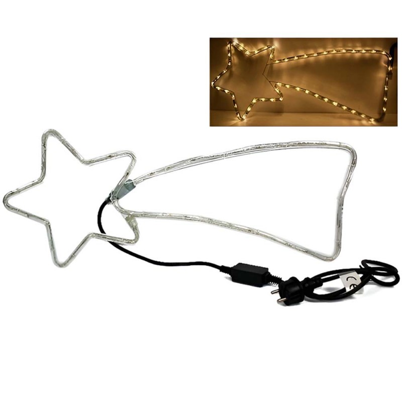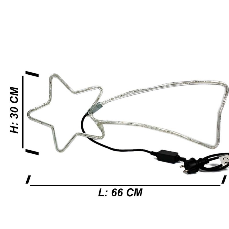 Illuminazione natalizia a forma di stella cometa, alta 30 cm e lunga 66 cm circa, con 48 luci LED bianche calda. 7 luci lampeggianti per un effetto unico. Cavo di alimentazione di 150 cm. Corrente 220/240 V - 50 Hz, potenza 3,6 watt, IP44 per uso interno ed esterno. Se ordinato entro le 13:00, spediremo lo stesso giorno con codice tracking del corriere e consegna entro 48 ore (se il corriere non ha intoppi).