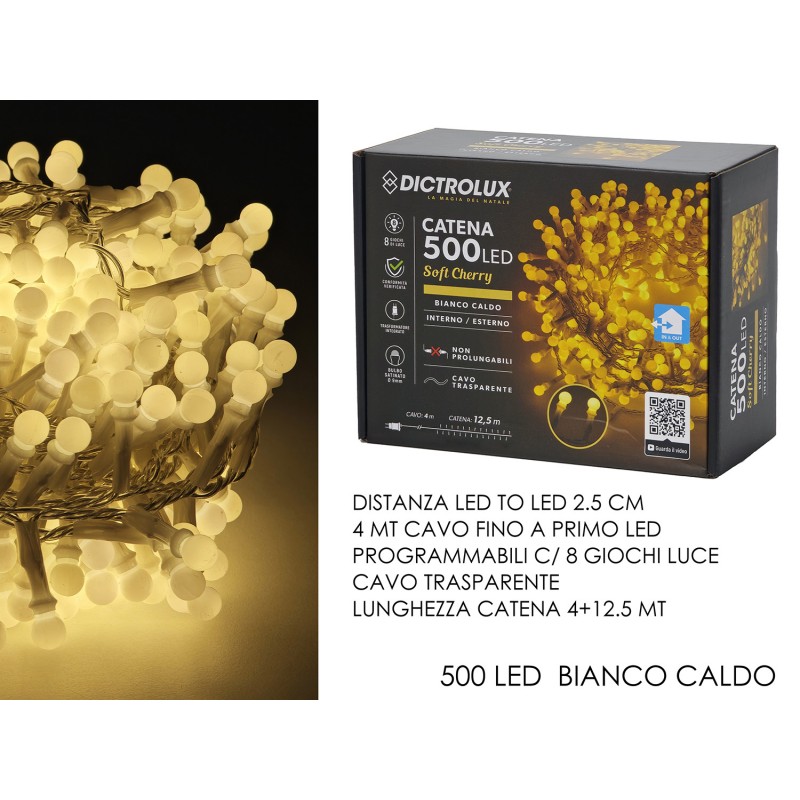 Con 500 LED a luce bianco caldo, distribuiti su una catena di 12,5 metri più 4 metri di cavo di alimentazione, garantisce un effetto luminoso uniforme, elegante e di grande impatto visivo.