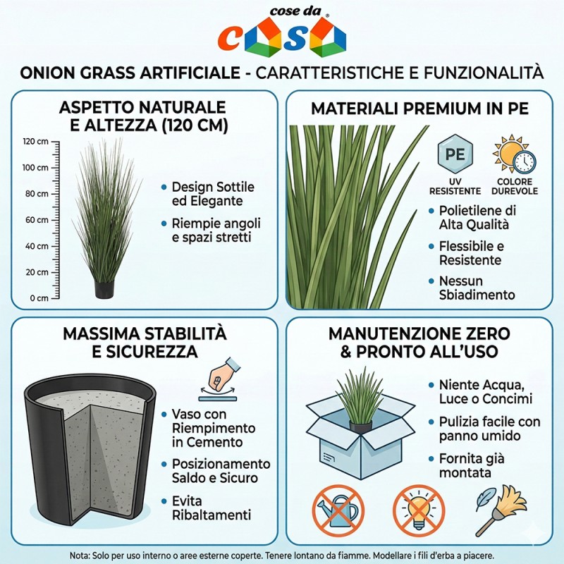 Cose da Casa vi propone soluzioni intelligenti e di stile, pensate per chi non vuole rinunciare alla bellezza nella propria quotidianità. Questa Onion Grass artificiale da 120 cm è realizzata in PE flessibile e resistente, offrendo un aspetto naturale e slanciato. Viene fornita con un pratico vaso nero in plastica appesantito con cemento per garantire la massima stabilità in ogni ambiente. Ideale per valorizzare angoli di casa, uffici o showroom con un tocco di verde moderno.