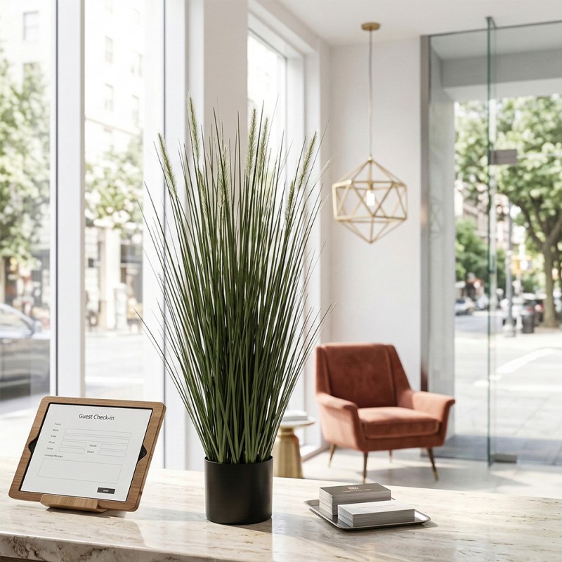 La Onion Grass è perfetta per creare divisioni visive leggere in uffici open space o per incorniciare una vetrina commerciale. Per la manutenzione, è sufficiente passare periodicamente un panno leggermente umido o utilizzare un getto d'aria fredda (come un asciugacapelli) a distanza per rimuovere la polvere accumulata tra i fili d'erba, mantenendo la brillantezza del materiale PE.