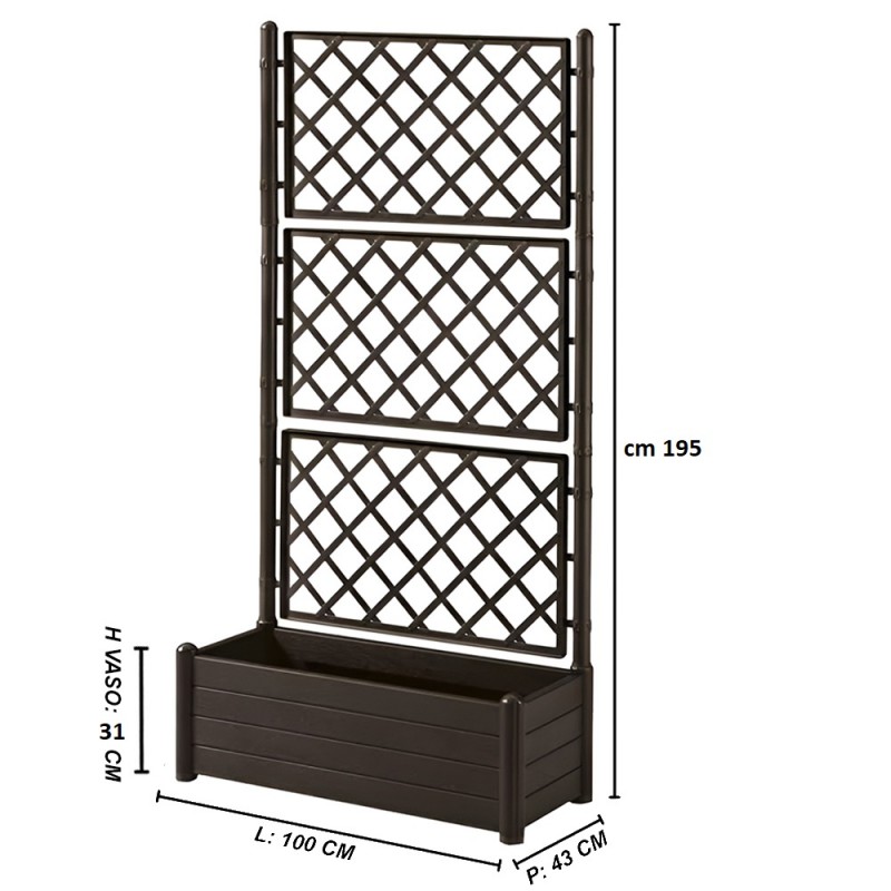 Fioriera con spalliera grigliata in plastica resistente, ideale per esterni. Dal design moderno ed elegante, questa fioriera effetto legno è perfetta per giardini, terrazze, balconi, piscine o locali commerciali. Il vaso misura 100 cm di larghezza, 43 cm di profondità e 31 cm di altezza, per una capienza totale di 80 litri. La spalliera graticola misura 98 cm di larghezza per 152 cm di altezza, per un’altezza complessiva di 195 cm, offrendo così una soluzione anche come separé o schermo frangivista.