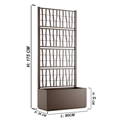 Fioriera rettangolare da esterni con spalliera alta 175 cm e vasca 80 L (P36 × L80 × H 35 cm). COLOR Grafite Realizzata in robusto materiale 100 % riciclato e riciclabile. Pedana drenante interna per ottimale gestione dell’acqua e prevenzione ristagni. Perfetta per piante ornamentali e rampicanti, offre privacy e valore estetico a giardini, terrazzi, bar, hotel e ristoranti. Colore determina: antracite elegante, marrone rustico, bianco luminoso (selezionare in fase d’ordine). Peso contenuto, facile montaggio.