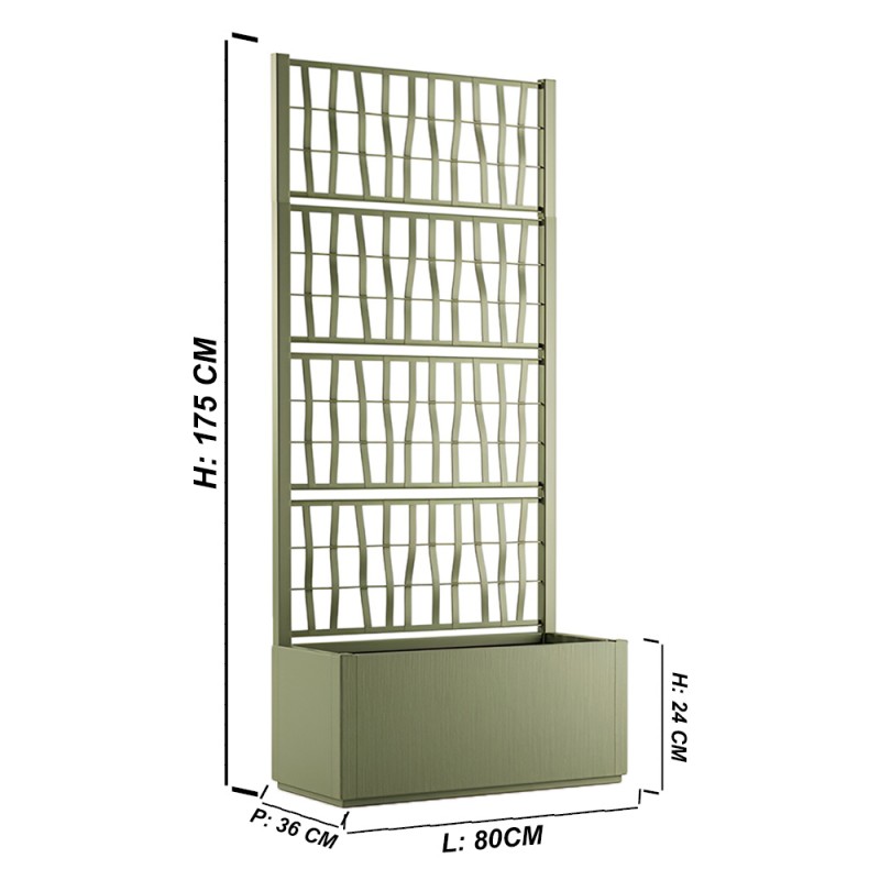 Fioriera rettangolare da esterni con spalliera alta 175 cm e vasca 80 L (P36 × L80 × H24 cm). COLOR Verde Oliva Realizzata in robusto materiale 100 % riciclato e riciclabile. Pedana drenante interna per ottimale gestione dell’acqua e prevenzione ristagni. Perfetta per piante ornamentali e rampicanti, offre privacy e valore estetico a giardini, terrazzi, bar, hotel e ristoranti. Colore determina: antracite elegante, marrone rustico, bianco luminoso (selezionare in fase d’ordine). Peso contenuto, facile montaggio.