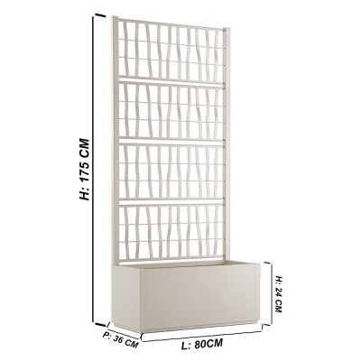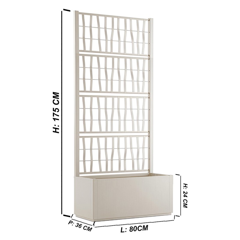 Fioriera rettangolare da esterni con spalliera alta 175 cm e vasca 80 L (P36 × L80 × H24 cm). COLOR gesso Realizzata in robusto materiale 100 % riciclato e riciclabile. Pedana drenante interna per ottimale gestione dell’acqua e prevenzione ristagni. Perfetta per piante ornamentali e rampicanti, offre privacy e valore estetico a giardini, terrazzi, bar, hotel e ristoranti. Colore determina: antracite elegante, marrone rustico, bianco luminoso (selezionare in fase d’ordine). Peso contenuto, facile montaggio.