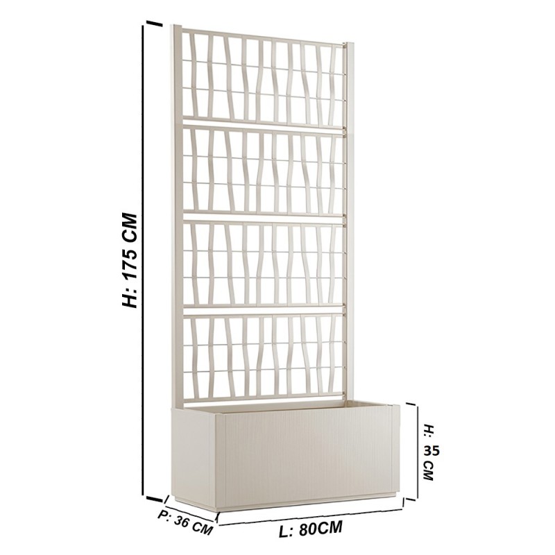 Fioriera rettangolare da esterni con spalliera alta 175 cm e vasca 80 L (P36 × L80 × H35 cm). COLOR gesso Realizzata in robusto materiale 100 % riciclato e riciclabile. Pedana drenante interna per ottimale gestione dell’acqua e prevenzione ristagni. Perfetta per piante ornamentali e rampicanti, offre privacy e valore estetico a giardini, terrazzi, bar, hotel e ristoranti. Colore determina: antracite elegante, marrone rustico, bianco luminoso (selezionare in fase d’ordine). Peso contenuto, facile montaggio.