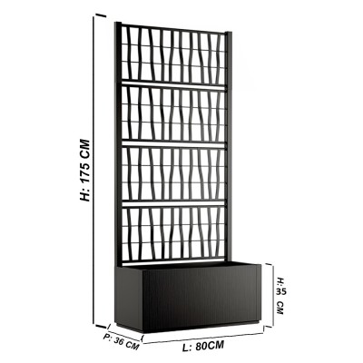 Fioriera rettangolare da esterni con spalliera alta 175 cm e vasca 80 L (P36 × L80 × H 35 cm). COLOR Grafite Realizzata in robusto materiale 100 % riciclato e riciclabile. Pedana drenante interna per ottimale gestione dell’acqua e prevenzione ristagni. Perfetta per piante ornamentali e rampicanti, offre privacy e valore estetico a giardini, terrazzi, bar, hotel e ristoranti. Colore determina: antracite elegante, marrone rustico, bianco luminoso (selezionare in fase d’ordine). Peso contenuto, facile montaggio.