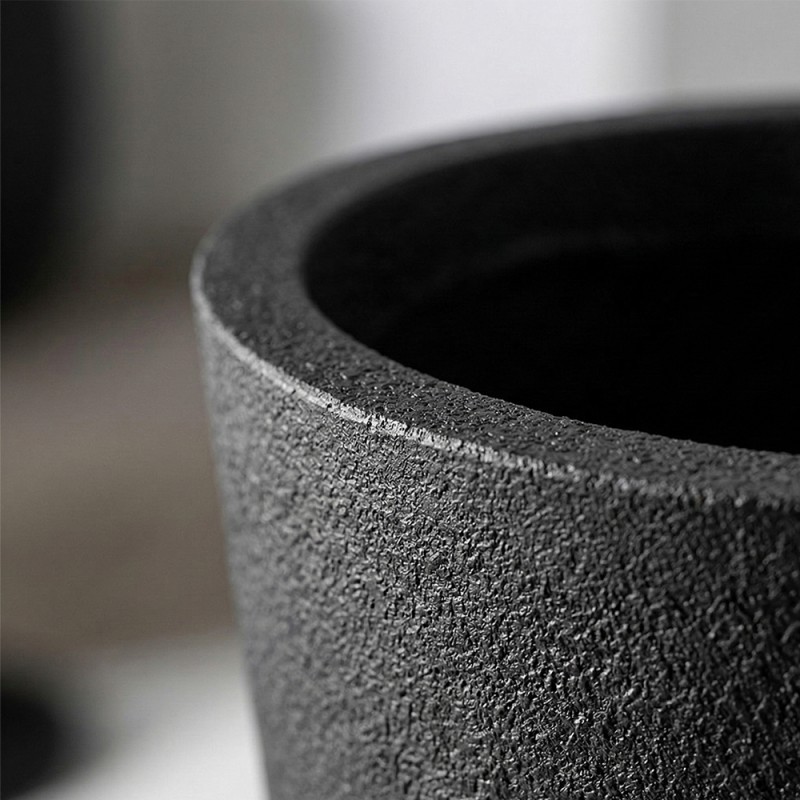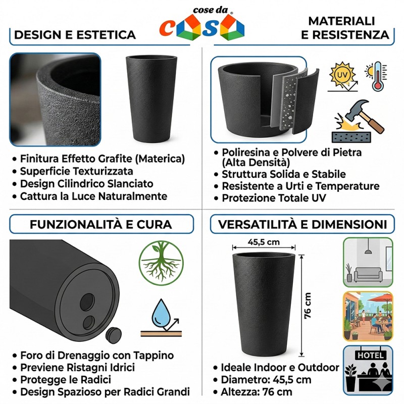 Cose da casa vi propone un elemento d'arredo che unisce l'estetica primordiale della pietra alla funzionalità dei materiali compositi d'avanguardia. Questo vaso alto e rotondo della linea BLACK si distingue per la sua finitura effetto grafite, una superficie texturizzata che cattura la luce in modo naturale, come mostrato nei dettagli fotografici. La costruzione in poliresina ad alta densità miscelata con polvere di pietra assicura un manufatto solido, pesante quanto basta per garantire stabilità, ma estremamente resistente agli urti e alle escursioni termiche.
