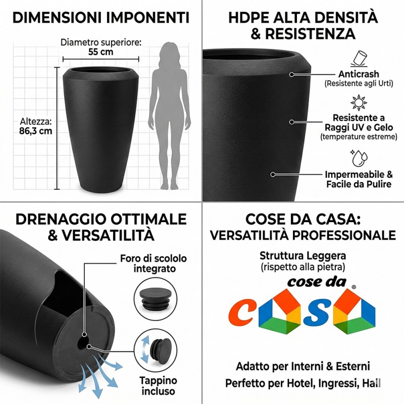 Cose da Casa vi propone soluzioni intelligenti e di stile, pensate per chi non vuole rinunciare alla bellezza nella propria quotidianità.Imponente vaso alto a cilindro realizzato in HDPE (poliresina ad alta densità) nel raffinato colore nero effetto grafite. Il set comprende un pezzo singolo di grandi dimensioni (Diametro 55 cm, Altezza 86,3 cm), perfetto per ospitare piante importanti e arredare con eleganza ampi spazi. La struttura garantisce massima durabilità e una sorprendente leggerezza nel posizionamento. Se ordinato entro le 13:00 spediremo lo stesso giorno con codice tracking del corriere e consegna entro 48 ore (se il corriere non ha intoppi).