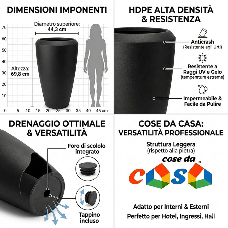 Cose da Casa vi propone soluzioni intelligenti e di stile, pensate per chi non vuole rinunciare alla bellezza nella propria quotidianità.Elegante vaso alto a forma cilindrica realizzato in HDPE (poliresina ad alta densità) nel raffinato colore NERO con effetto grafite. Il set include un pezzo singolo dalle dimensioni generose (Diametro 44,3 cm, Altezza 69,8 cm), ideale per valorizzare ogni angolo verde o interno di design. La struttura robusta garantisce massima resistenza climatica pur mantenendo una leggerezza che ne facilita lo spostamento.