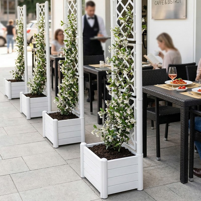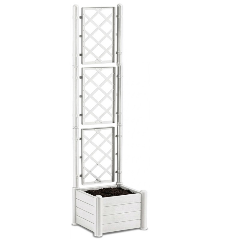 Questa elegante fioriera bianca con spalliera alta 195 cm include un vaso capiente da 30 litri (43x43x31 cm). Realizzata in plastica Made in Italy con raffinato effetto legno, è la soluzione ideale per creare pareti verdi luminose, zone di privacy e divisori modulari per ogni spazio all'aperto.