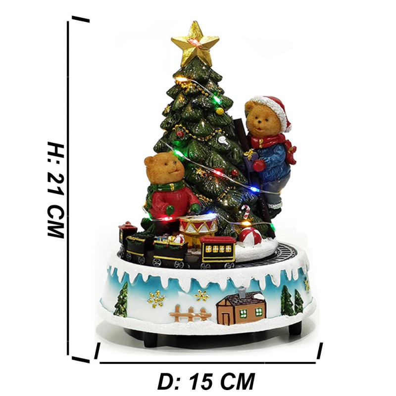 Realizzato con materiali resistenti e dettagli ben rifiniti, questo carillon è alto 21,5 cm con un diametro di 15 cm, perfetto da posizionare su mobili, tavolini, mensole o vetrine. Il funzionamento avviene tramite batterie AA (non incluse). Basta inserirle per dare vita alla scena: l'albero si illumina, il trenino si muove e si attivano dolci melodie natalizie.