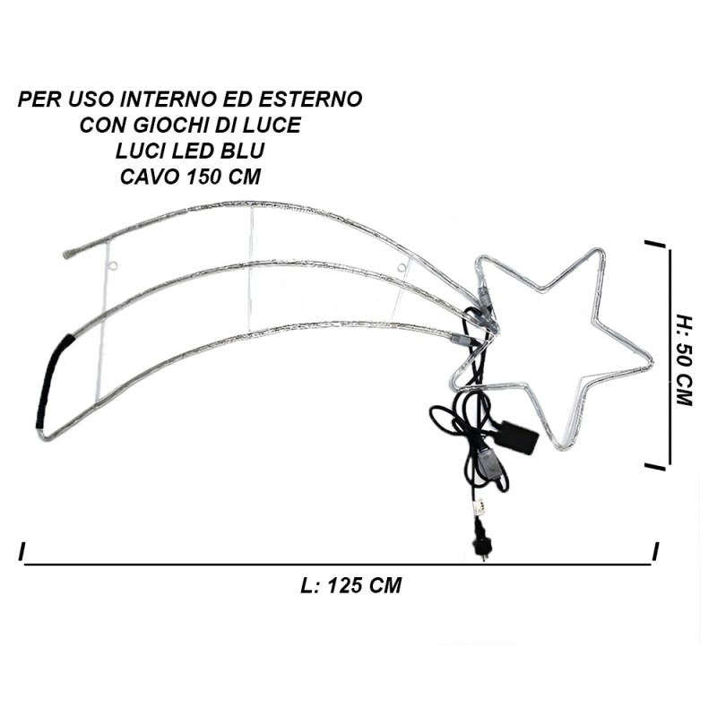Illuminazione natalizia Grande a forma di stella cometa, alta 50 cm e lunga125 cm, con 180 luci LED BLU,la particolarita sta nell'effetto,la stella resta fissa mentre la coda ha un effetto movimento scorrevole,effetto unico. Cavo di alimentazione di 150 cm. Corrente 220/240 V - 50 Hz, potenza 7.2 watt, IP44 per uso interno ed esterno.