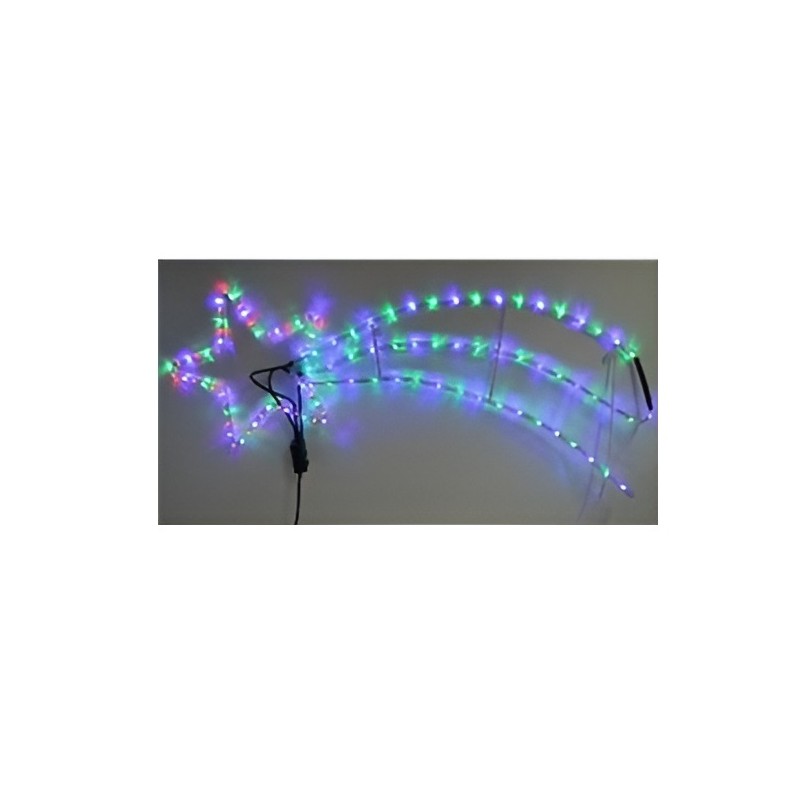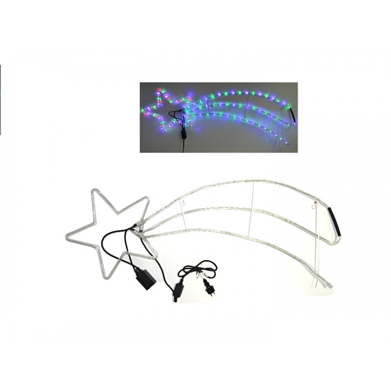 Illuminazione natalizia Grande a forma di stella cometa, alta 50 cm e lunga125 cm, con 180 luci LED multicolor ,la particolarita sta nell'effetto,la stella resta fissa mentre la coda ha un effetto movimento scorrevole,effetto unico. Cavo di alimentazione di 150 cm. Corrente 220/240 V - 50 Hz, potenza 7.2 watt, IP44 per uso interno ed esterno.