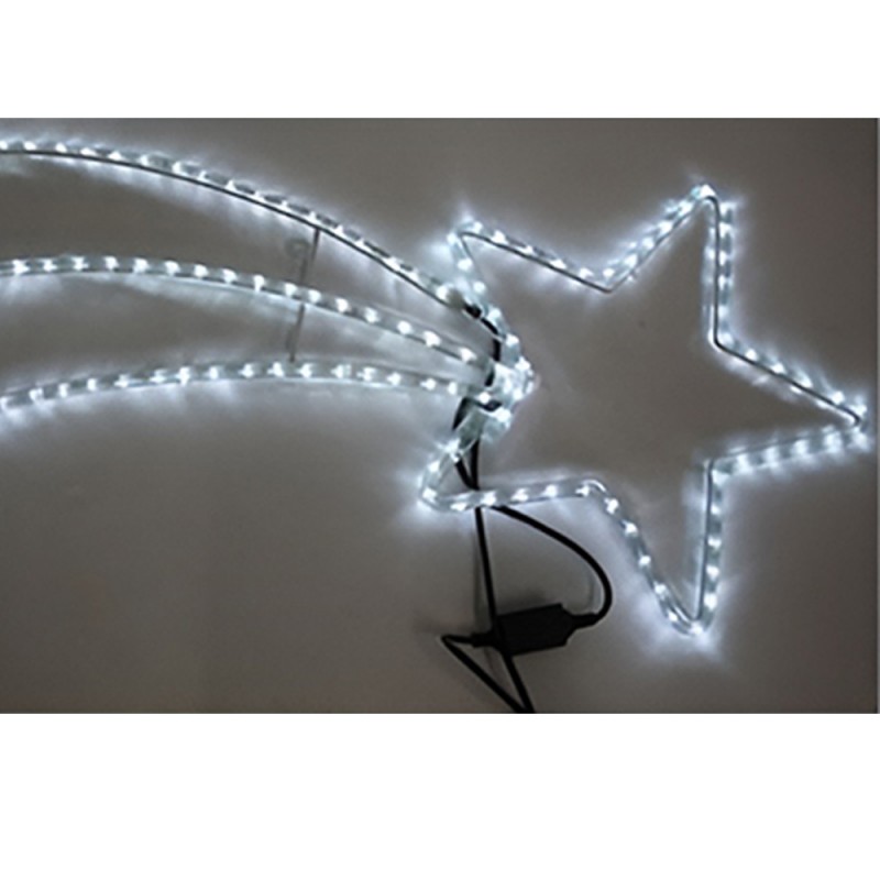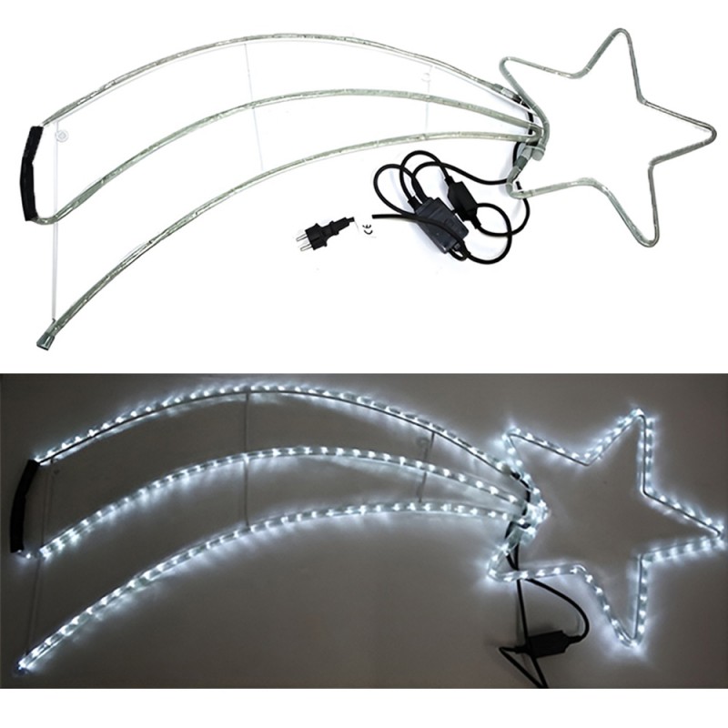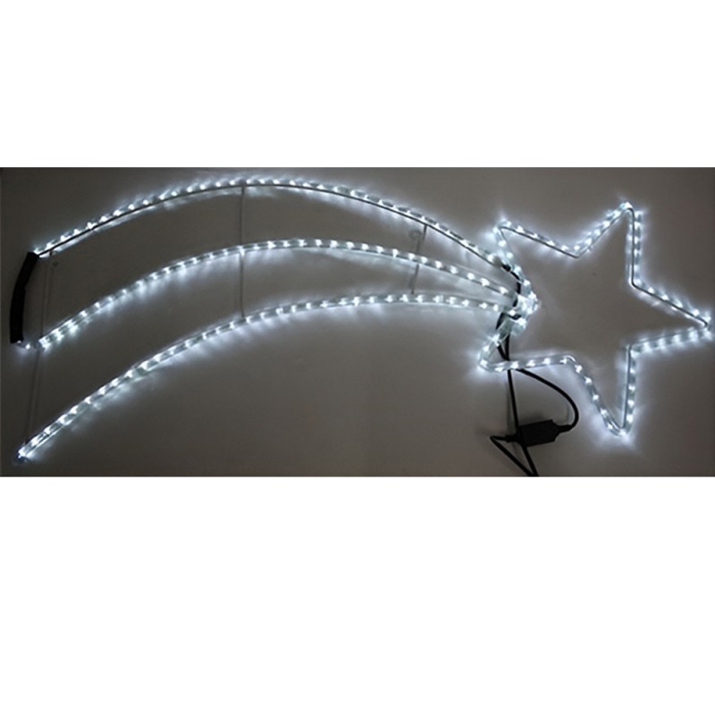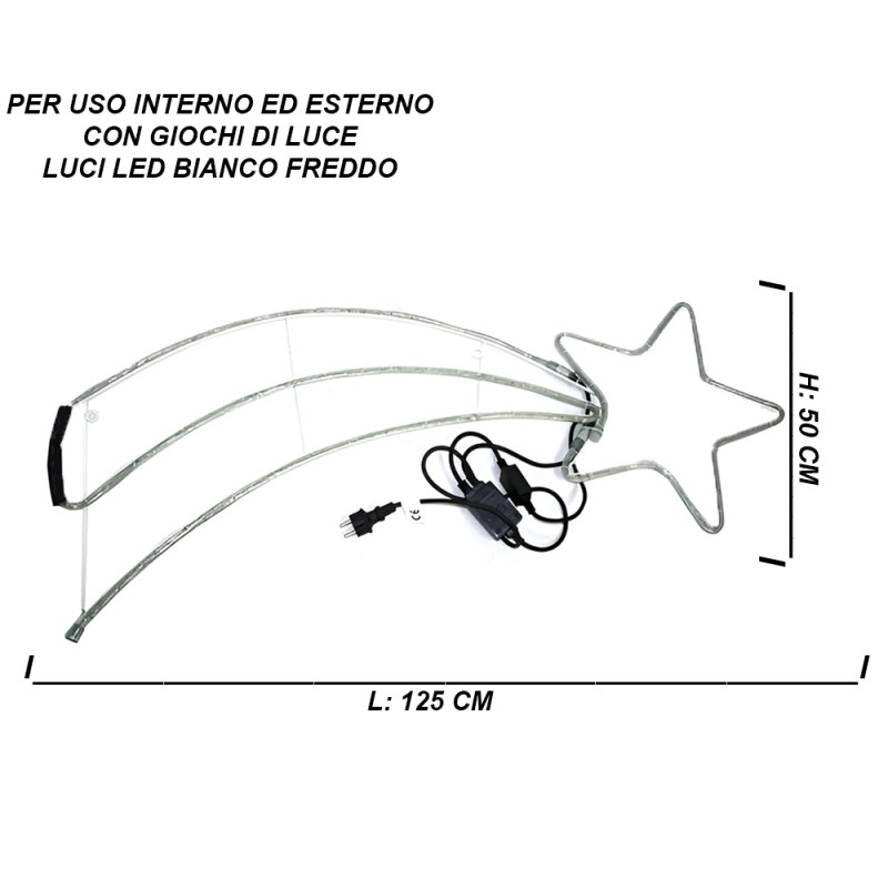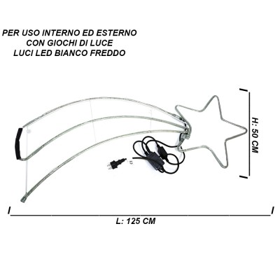 Illuminazione natalizia Grande a forma di stella cometa, alta 50 cm e lunga125 cm, con 180 luci LED BIANCO FREDDO, la particolarita sta nell'effetto,la stella resta fissa mentre la coda ha un effetto movimento scorrevole,effetto unico. Cavo di alimentazione di 150 cm. Corrente 220/240 V - 50 Hz, potenza 7.2 watt, IP44 per uso interno ed esterno.