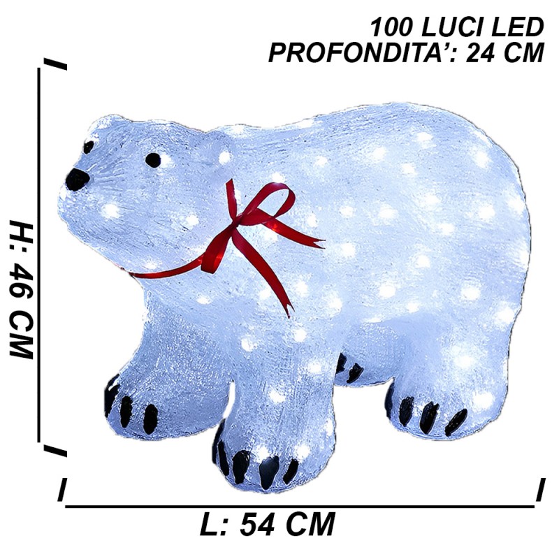 COSEDACASA Vi propone un'elegante decorazione natalizia a forma di orso polare in cammino, realizzata in acrilico resistente con finitura bianca ghiaccio e dettagli realistici. L’orso è alto 46 cm, largo 54 cm e profondo 24 cm, ed è illuminato da 100 luci LED bianche fredde che lo rendono visibile e incantevole sia di giorno che di sera.