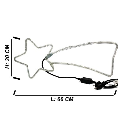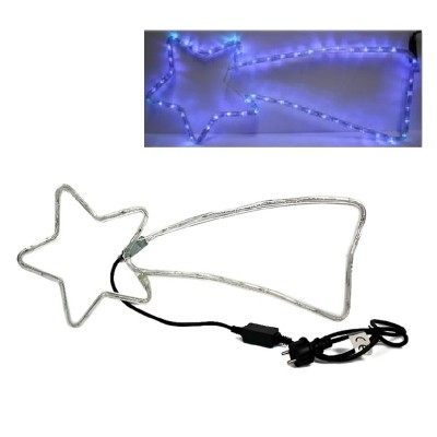 Illuminazione natalizia a forma di stella cometa, alta 30 cm e lunga 66 cm circa, con 48 luci LED BLU 7 luci lampeggianti per un effetto unico. Cavo di alimentazione di 150 cm. Corrente 220/240 V - 50 Hz, potenza 3,6 watt, IP44 per uso interno ed esterno. Se ordinato entro le 13:00, spediremo lo stesso giorno con codice tracking del corriere e consegna entro 48 ore (se il corriere non ha intoppi).