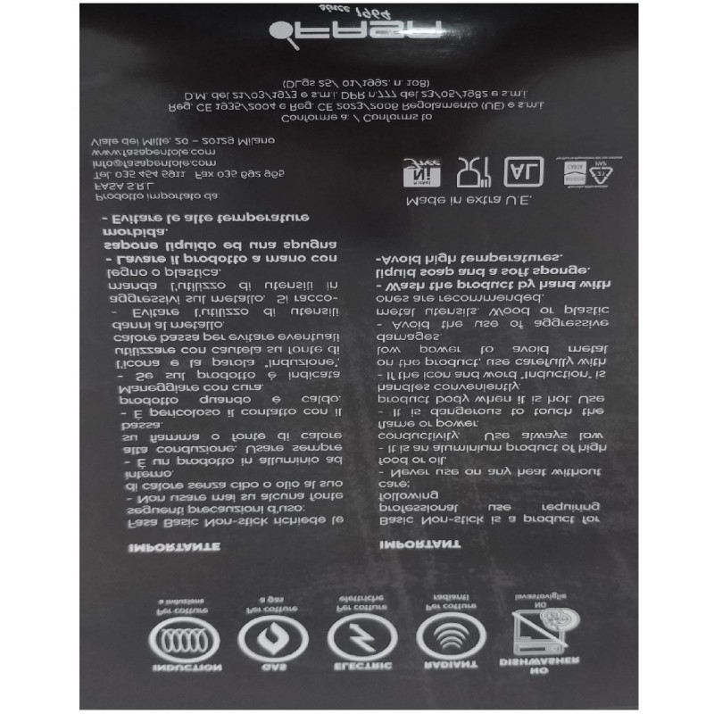 Il rivestimento antiaderente Greblon 3C, privo di PFOA, garantisce eccellenti performance anche dopo numerosi utilizzi. Il manico in acciaio inox è ergonomico, fissato in modo professionale, resistente al calore e adatto anche all’uso in forno (entro i limiti consigliati).