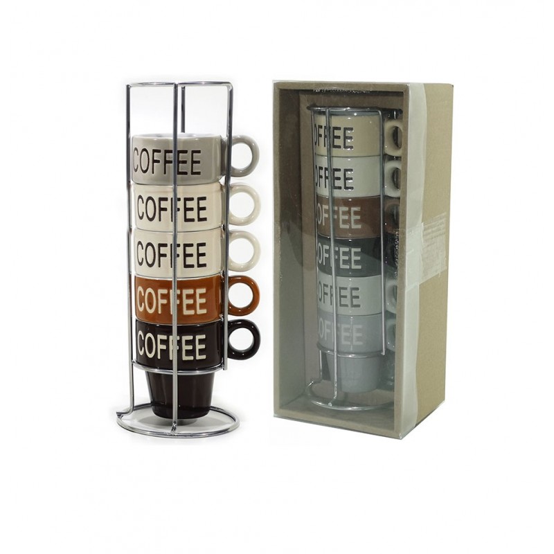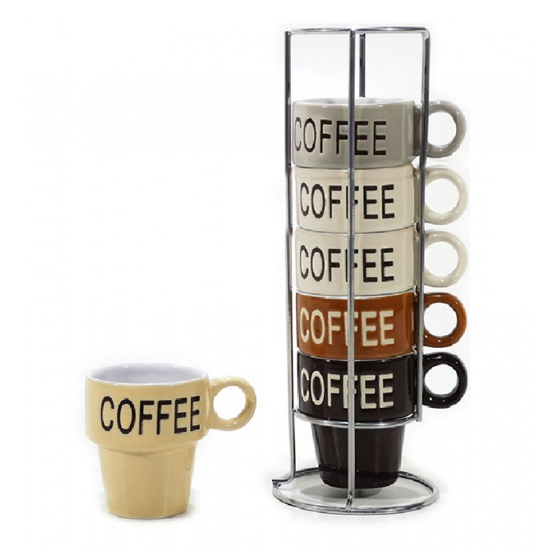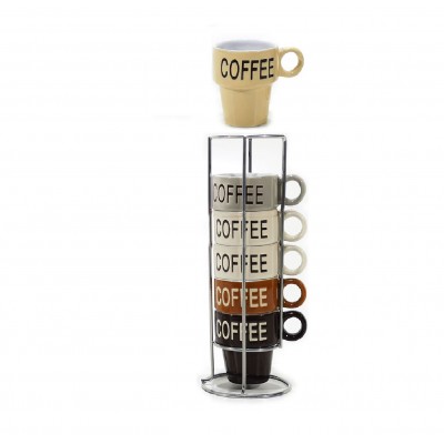 Realizzate in ceramica resistente e dai colori assortiti, le tazzine da 9 cl sono dotate di una gradevole scritta “Coffee” e di un pratico supporto in acciaio cromato, ideale per tenerle sempre ordinate e a portata di mano.
