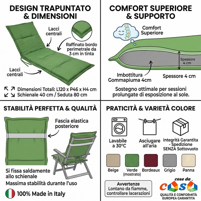 Singolo cuscino imbottito di alta qualità per sedia a sdraio, realizzato in resistente poli-cotone con imbottitura in gommapiuma da 4 cm.Il prodotto presenta dimensioni totali di 120x46 cm (schienale 40 cm, seduta 80 cm) ed è rifinito con un elegante bordo perimetrale di 3 cm.