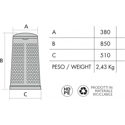 Realizzato in PEHD (Polietilene ad alta densità), riciclabile al 100%, il trespolo porta rifiuti da 110 litri è un prodotto leggero, facilmente sollevabile e per questo idoneo a qualsiasi contesto di utilizzo.