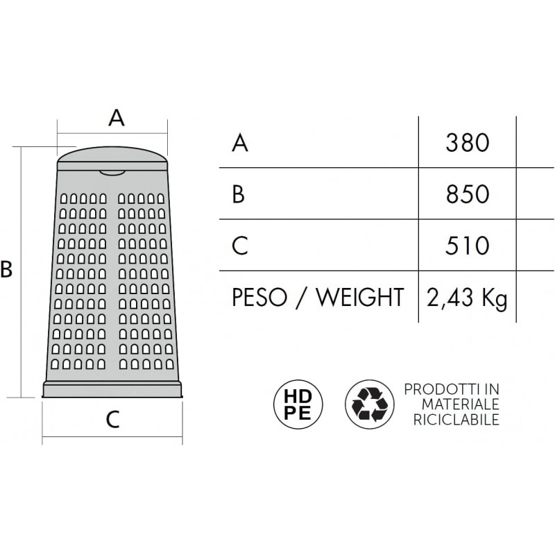 Capacità: 50 Litri, ideale per famiglie e ambienti di lavoro.Materiale: Realizzato in plastica resistente , Made in Italy.Design: Colore blu e bianca moderno ed elegante, con coperchio per una maggiore igiene.Dimensioni: H 57 x P 37 x L 37 cm, compatto ma capiente.Uso Multiuso: Perfetto per raccolta differenziata o come contenitore per panni da bucato.Facilità di Pulizia: Superficie liscia che facilita la rimozione dello sporco.Sicurezza e Qualità: Conformità alle normative europee per garantire il massimo della sicurezza e affidabilità.Misure: altezza 53 cm, diametro superiore 45 cm, diametro inferiore 35.2cm.