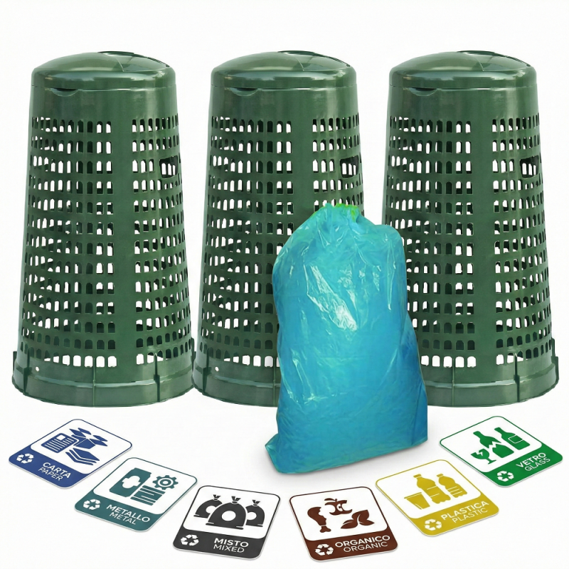 Questo set di 3 trespoli da 100 litri Made in Italy offre una soluzione pratica e igienica per la raccolta differenziata. La struttura traforata previene gli odori, mentre il kit incluso di 20 sacchi e 6 etichette da poter scegliere e sitemare a vostro piacimento li rende immediatamente pronto all'uso in giardino in casa eventi sagre feste locali commerciali. Leggero, lavabile e resistente, è l'alleato perfetto per l'ordine dei vostri spazi.