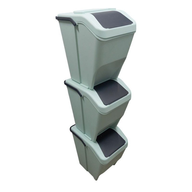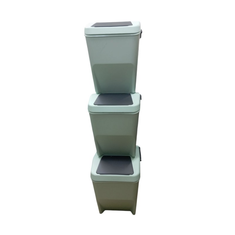 Tris di pattumiere modulabili sovrapponibili e impilabili per la raccolta differenziata, ideali per cucina, balcone, terrazze o sottolavello. Ogni contenitore ha una capacità di 25 litri, dimensioni H38 x L30 x P38 cm, ed è realizzato in polipropilene di alta qualità, e facile da pulire. La struttura 100% Made in Italy in un moderno colore VERDE SALVIA è la soluzione ideale per la raccolta differenziata. Dotata di un pratico manico ANTRACITE richiudibile per un facile trasporto e di uno sportellino ANTRACITE, pensata per durare nel tempo e per offrire una soluzione pratica e ordinata alla gestione dei rifiuti domestici.