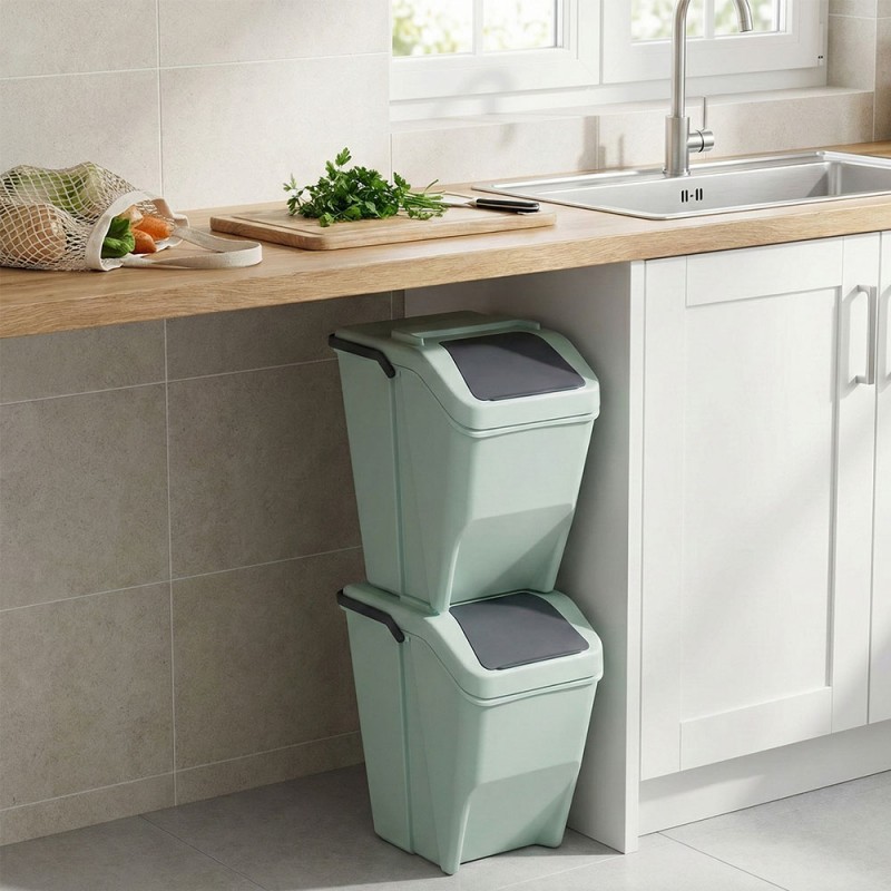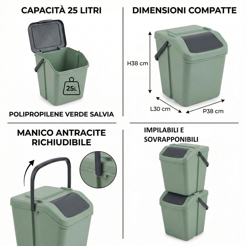 COSEDACASA Vi propone un pratico e funzionale tris di pattumiere modulabili sovtapponibili e impilabili da 25 litri ciascuna, perfetto per facilitare la raccolta differenziata in ogni ambiente domestico. Realizzate interamente in Italia con polipropilene robusto, queste pattumiere sono pensate per offrire massima resistenza e praticità d’uso.Un moderno colore VERDE SALVIA è la soluzione ideale per la raccolta differenziata. Dotata di un pratico manico ANTRACITE richiudibile per un facile trasporto e di uno sportellino ANTRACITE, pensata per durare nel tempo e per offrire una soluzione pratica e ordinata alla gestione dei rifiuti domestici.