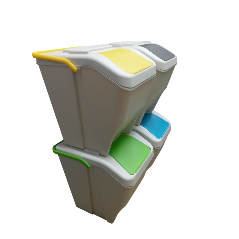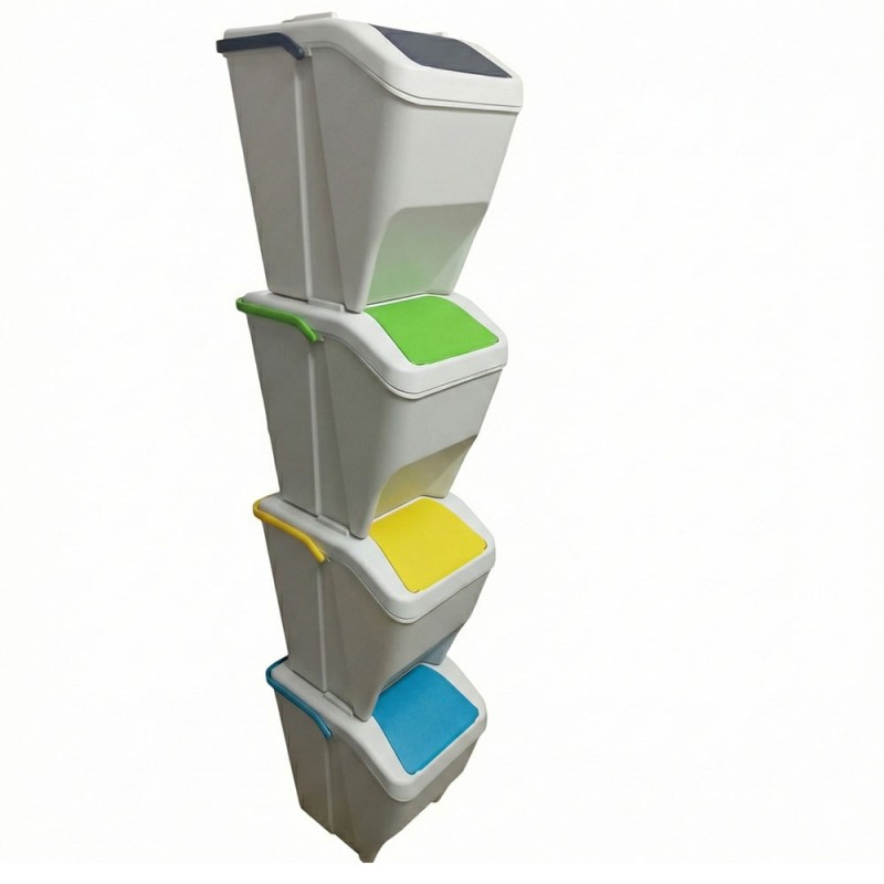Set di 4 pattumiere modulabili sovrapponibili e impilabili per la raccolta differenziata, ideali per cucina, balcone, terrazze o sottolavello. Ogni contenitore ha una capacità di 25 litri, dimensioni H38 x L30 x P38 cm, ed è realizzato in polipropilene di alta qualità, e facile da pulire. La struttura 100% Made in Italy in un moderno colore bianco caldo è la soluzione ideale per la raccolta differenziata. Dotata di un pratico manico colorato ( verde giallo blu antracite) richiudibile per un facile trasporto e di uno sportellino ( verde giallo blu antracite), pensata per durare nel tempo e per offrire una soluzione pratica e ordinata alla gestione dei rifiuti domestici. Il set sovrapposto uno sull'altro misura H150 x L30 x P40 cm si consiglia di poggiarlo a parete, mentre posizionato a set da 2 di fianco misura :H76 x L60 x P40