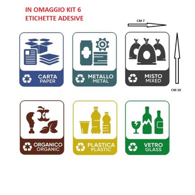 Inoltre Disponibile l'acquisto SEPARATAMENTE anche il kit di 6 etichette adesive per i bidoni: carta, plastica, metalli, vetro, umido, indifferenziata, misto