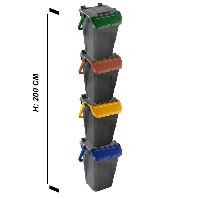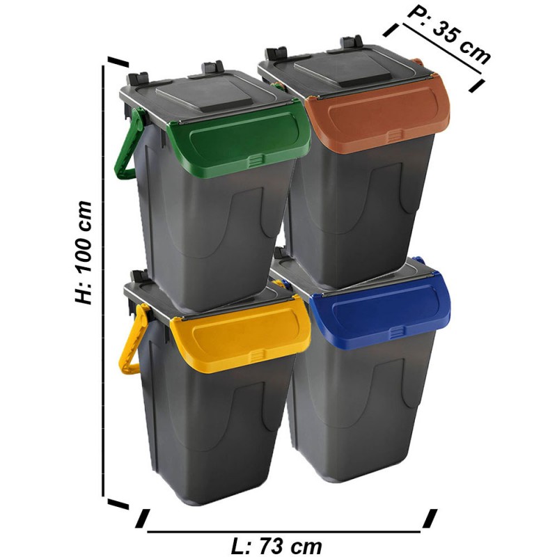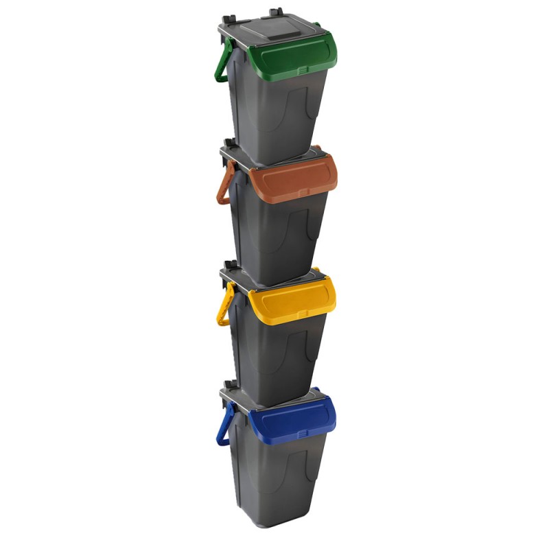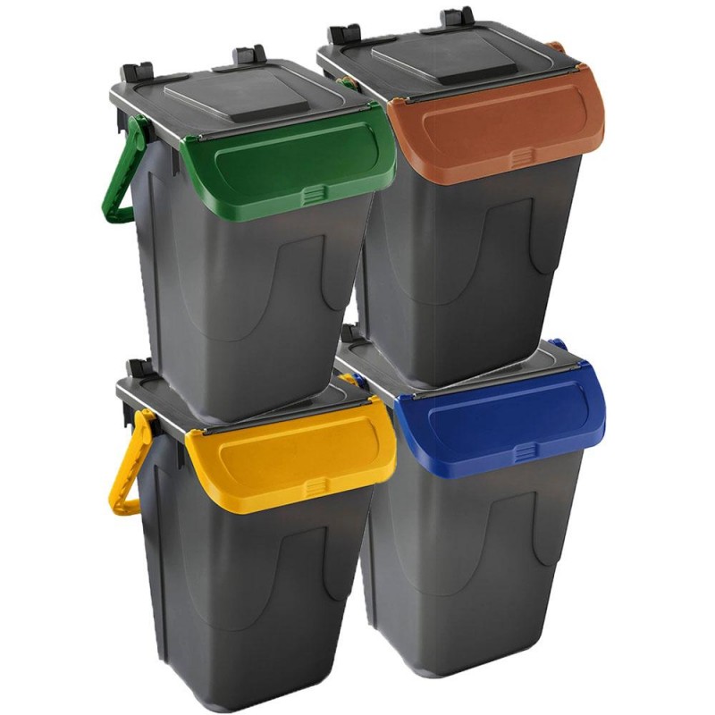 Cosedacasa vi propone questo set di 4 bidoni per raccolta differenziata urbana e domestica da 35 litri cadauno, con base di colore grigio e coperchio marrone, giallo, blu o verde, contenitori bidoni per l'immondizia