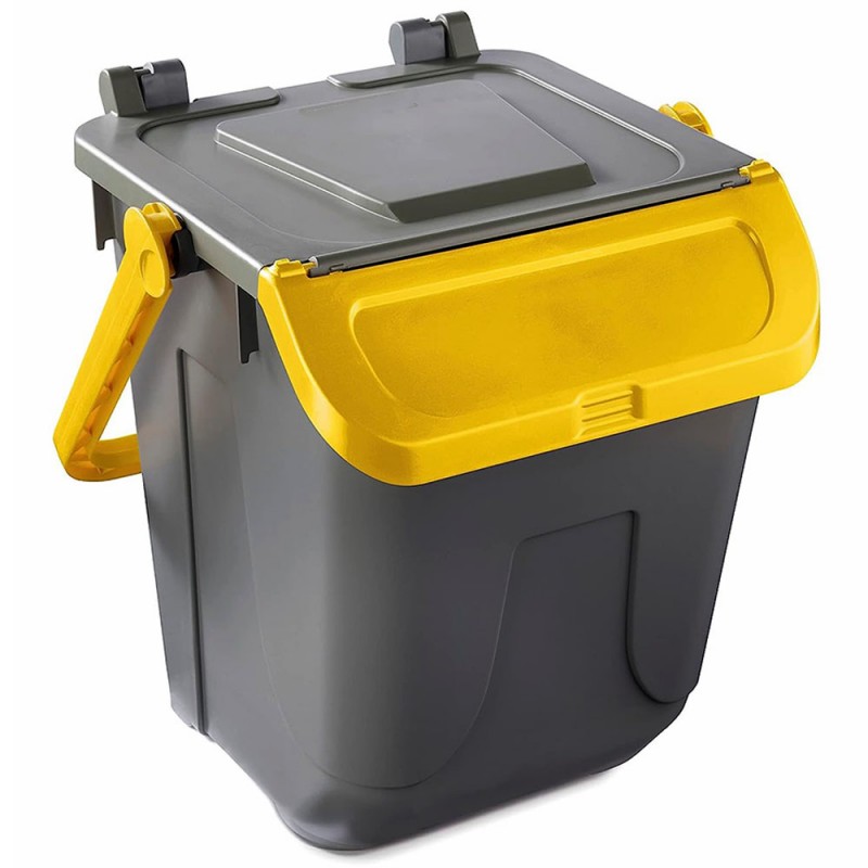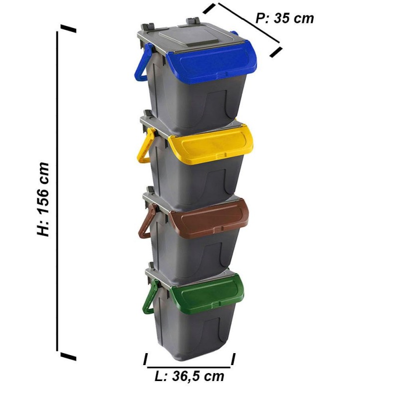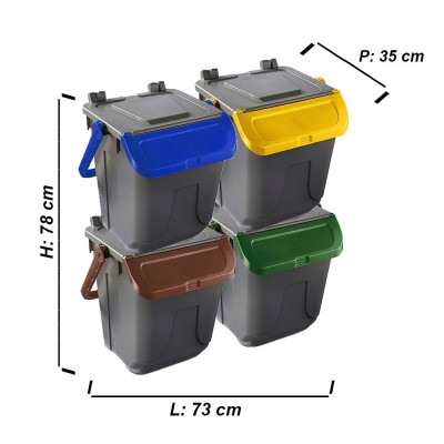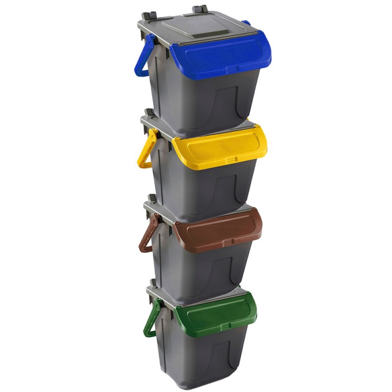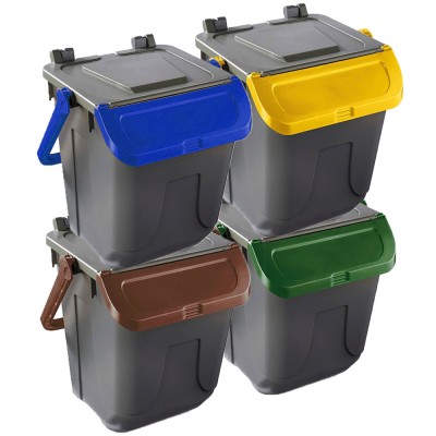 Cosedacasa vi propone questo set di 4 bidoni per raccolta differenziata urbana e domestica da 25 litri cadauno, con base di colore grigio e coperchio marrone, giallo, blu o verde, contenitori bidoni per l'immondizia