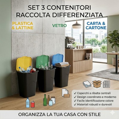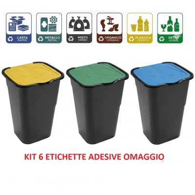 La qualità costruttiva si riflette nell'utilizzo di plastica ad alta resistenza, ideale per sopportare l'uso intensivo quotidiano. La base nera è pensata per mantenere un aspetto sempre decoroso, mimetizzando eventuali segni di usura, mentre i coperchi basculanti o a incastro (verde, giallo e blu) permettono di distinguere istantaneamente vetro, carta, plastica o organico secondo le necessità comunali.In Omaggio un set completo di 6 etichette adesive colorate e illustrative (7x10 cm) con le diciture Carta, Plastica, Metallo, Vetro, Umido e Misto. Potrete applicare le etichette sul fronte del cestino o sul coperchio in base alle vostre necessità, creando immediatamente un'isola ecologica chiara ed efficiente.