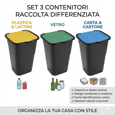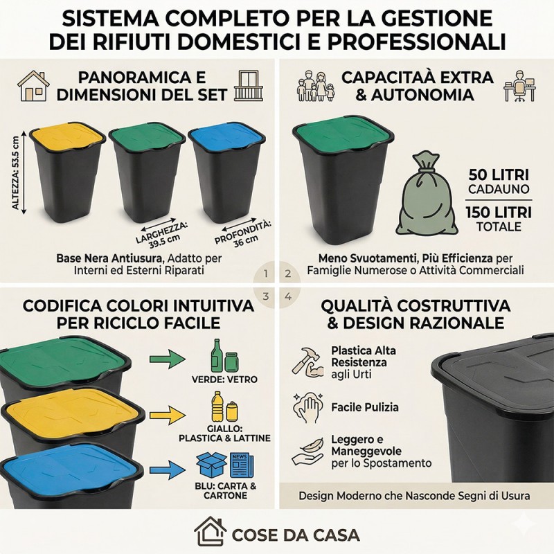 Questo set comprende 3 bidoni per la raccolta differenziata da 50 litri ciascuno, per una capacità totale di 150 litri.In Omaggio il kit di 6 etichette adesive da poter scegliere e sistemare a vostro piacimento li rende immediatamente pronto all'uso in giardino in casa eventi sagre feste locali commerciali. Leggero, lavabile e resistente, è l'alleato perfetto per l'ordine dei vostri spazi.