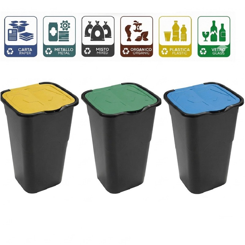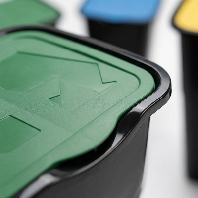 Realizzati in plastica nera con coperchi nei colori verde, giallo e blu, garantiscono una separazione dei rifiuti immediata e ordinata.