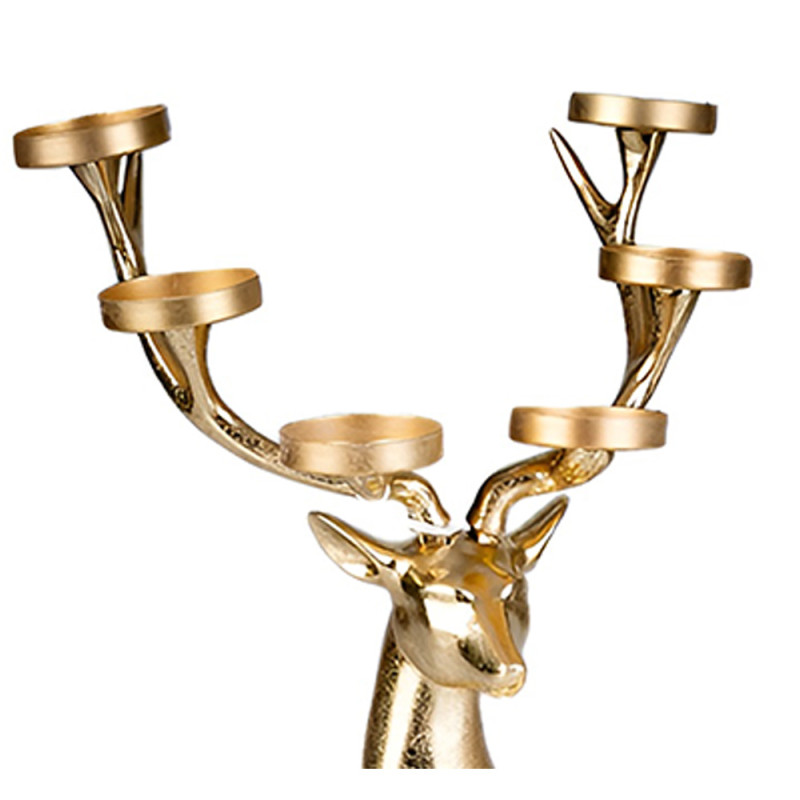 Questo candelabro a forma di renna, realizzato in resina dorata, misura 62 cm di altezza e 51 cm di larghezza. Con 6 braccia per candele, è perfetto per creare un'atmosfera raffinata nella tua sala da pranzo o sulla tua tavola da pranzo. Il design elegante e la finitura oro donano un tocco di lusso e classe. Adatto per candele cilindriche o tea light.