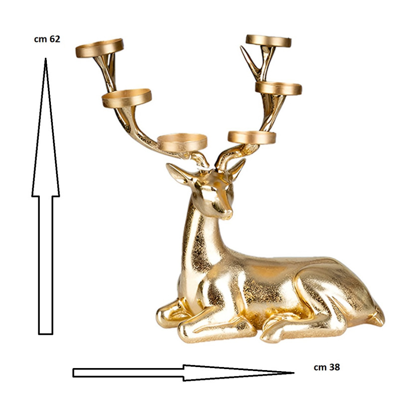 Questo candelabro a forma di renna seduta, realizzato in resina dorata, misura 62 cm di altezza e 38 cm di larghezza. Con 6 braccia per candele, è perfetto per aggiungere un tocco di lusso alla tua tavola da pranzo o al soggiorno. Il design raffinato e la finitura oro rendono questa decorazione un oggetto unico. Adatto per candele cilindriche o tea light.